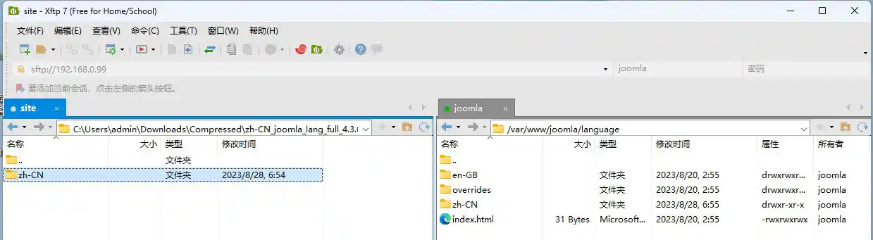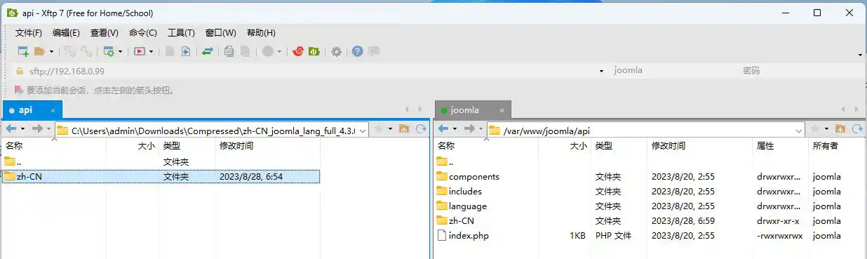 从Joomla官网下载tar.gz安装包,并上传至网站根目录,也可以直接在服务器上wget直接下载,当然也可以下载.zip包,只是需要在Debian上安装unzip或者解压后再上传,会有些麻烦,我个人比较习惯用Xshell,用Xftp上传文件也比较方便,所以选择下载后再上传。